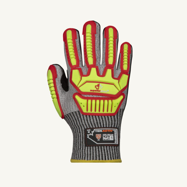 Our TenActiv Pro™ STAGBMPVB gloves feature ErgoHyde microfiber palms that provide improved hand movement and more grip than typical leather. TenActiv™ engineered yarn provides 360° cut protection with extreme ANSI A7 cut resistance, plus hi-viz back-of-hand bumpers offer improved hand placement visibility and ANSI 2 impact protection. Treated to resist water and liquids, their ErgoHyde palms offer an outstanding range of motion plus strong grip in wet conditions.