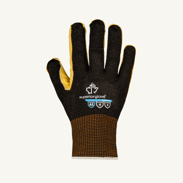Our KnitActiv Pro™ S13KBGLP cut-resistant gloves feature a flexible knit with leather palms that balances durability and flexibility when material handling. Made with engineered yarn, they offer 360° cut protection with ANSI A5 cut resistance while goatskin grain leather palms provide oil and liquid resistance. Their black shell hides dirt and wear and tear for a longer wear life.